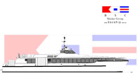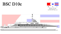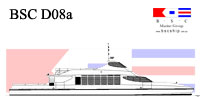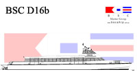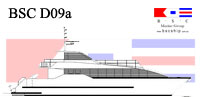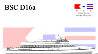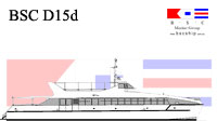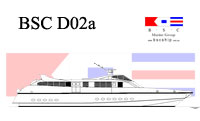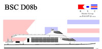 BSC D02a id a fast monohull design is suitable for vessel requirements of 250 passengers and over with a practical minimum vessel length of 30 metres suggested for an efficient length/beam ratio. The design has a raked stem and deep forefoot flowing to a round bilge with fine half angle of entry. Reserve buoyancy forward is provided by a stepped chine / spray rail which proceeds aft to become the planing chine from about midships. The hull bottom from forward midships to transom has variable deadrise from deep forward to a relatively flat transom. Constant low angled buttock lines through the planing surface provide performance at speed whilst fine forward waterlines and the deep V forward contribute to good seakeeping and ride into a head sea.